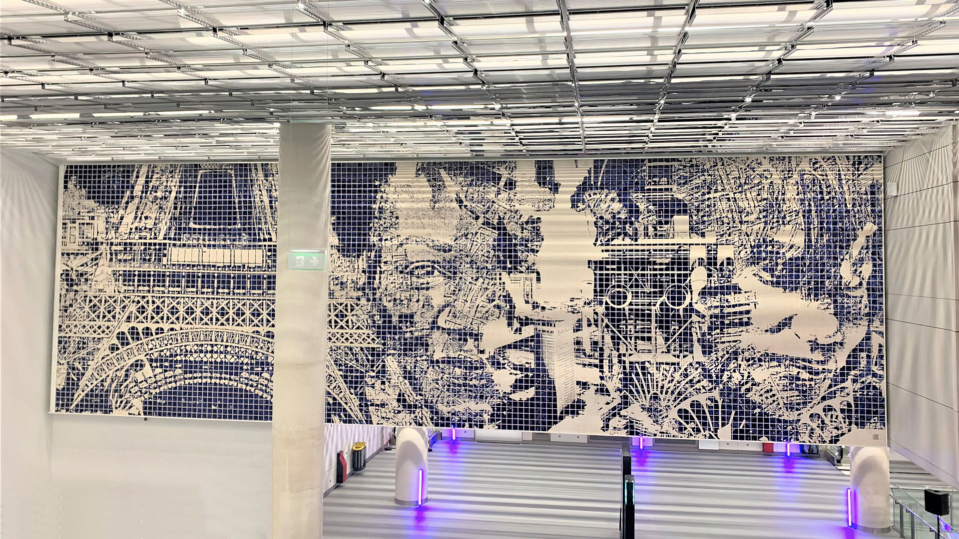 It includes the central element of Paris, which is the Eiffel Tower, as well as huge blueprints of the map of Paris that emerge from the blue tiles in the second layer and other iconic buildings that the station can connect you to. But it is also meant to welcome you, so I created the portraits that you see to give glimpses of people that are welcoming you and bringing you to your destination. I wanted an experience that would last for 15 or 30 seconds, one minute, as you pass by, where you see the city but also the people that live in that city and welcome you to it.